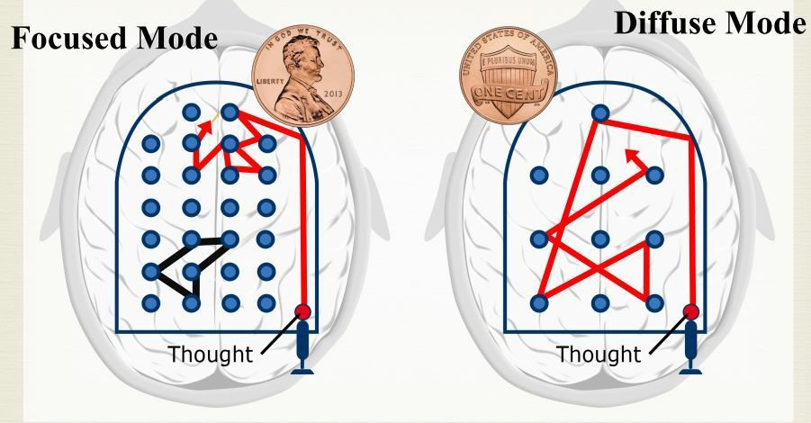 • Chế độ tập trung (focused mode): bộ não tập trung vào vấn đề trong một thời gian liên tục. Ở chế độ này, bộ não có xu hướng kết nối các tri thức, kinh nghiệm đã biết để đưa ra các giải pháp cho vấn đề.